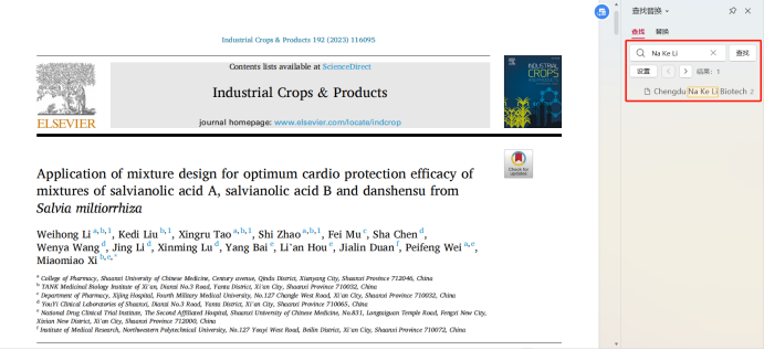 我公司為陜西中醫(yī)藥大學定制的丹參總酚酸、HPLC≥90%用于試驗研究,該項目發(fā)表的題目為《Application of mixture design for optimum cardio protection efficacy of mixtures of salvianolic acid A, salvianolic acid B and danshensu from Salvia miltiorrhiza》文章已被Industrial Crops & Products 192 (2023) 116095 期刊收錄;我們會繼續(xù)努力,為您的實驗保駕護航;最后感謝各位老師對鈉鈳鋰生物的信任和支持??!